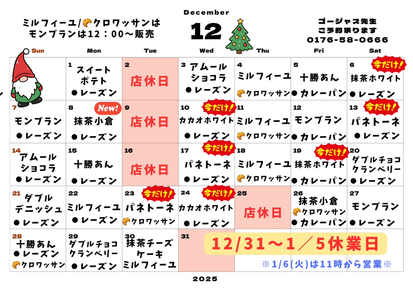12月の販売予定表 2025年11月29日 こんにちは♪ 11月27日に無事4周年を迎えました💫 5年目もよろしくお願いいたします。 12月は大人気カカオホワイトを2日間限定で販売いたします! 数量限定ですのでご予約をオススメしております🙇 忘年会などのイベント景品などに食パンや食パンギフト券はいかがでしょうか?🍞♡ 皆様のたくさんのご注文お待ちしております! \トイポアプリ又はお電話にてご予約受け付けております/ インスタグラムなどのメッセージは確認が遅くなることがありますので受け付けておりません。 📞0176-58-0666