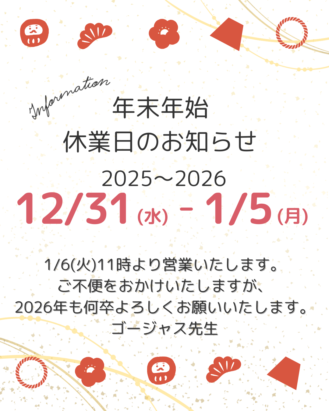 高級食パン専門店ゴージャス先生をいつもご愛顧いただき誠にありがとうございます。本日をもちまして今年の営業を終了させていただきます。今年の1年多くのお客様にご来店いただき心より感謝申し上げます。おかげさまで多くの方に当店の食パンをお楽しみいただくことができました。新年はさらにおいしいパンをお届けできるようスタッフ一同心を込めて準備を進めて参ります。新年の営業開始は2026年1月6日11時を予定しております。皆様のご来店を心よりお待ちしております。どうぞ良いお年をお迎えくださいませ。来年も変わらぬご愛顧を受け賜りますようお願い申し上げます。
