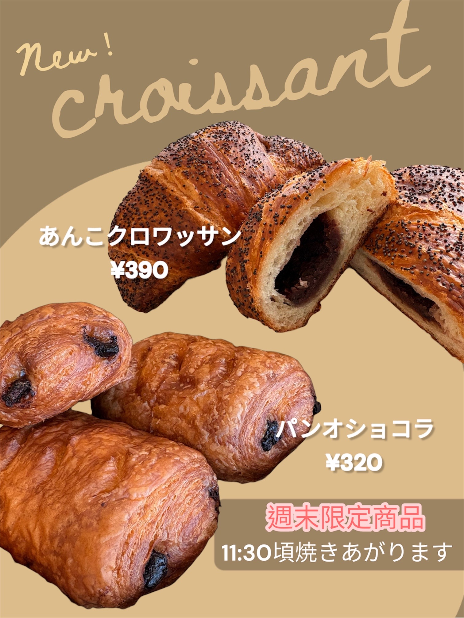 🥐週末限定商品のご案内🥐 2026年2月27日 こんにちは♪ 2月から【土日限定】として、 ⭐️パン・オ・ショコラ《11:30〜》 ⭐️あんこクロワッサン《11:30〜》 を販売しております!数に限りがありますのでご購入予定の方はご予約お待ちしております! その他にも 【曜日限定《11:30〜》バイカラークロワッサン🥐】 【毎日販売《11:30〜》発酵バタークロワッサン🥐】 販売しておりますので日替わりカレンダーをご覧ください🙇 ご予約のお電話は営業時間内にお願いいたします。 📞0176-58-0666【9:30〜12:30】